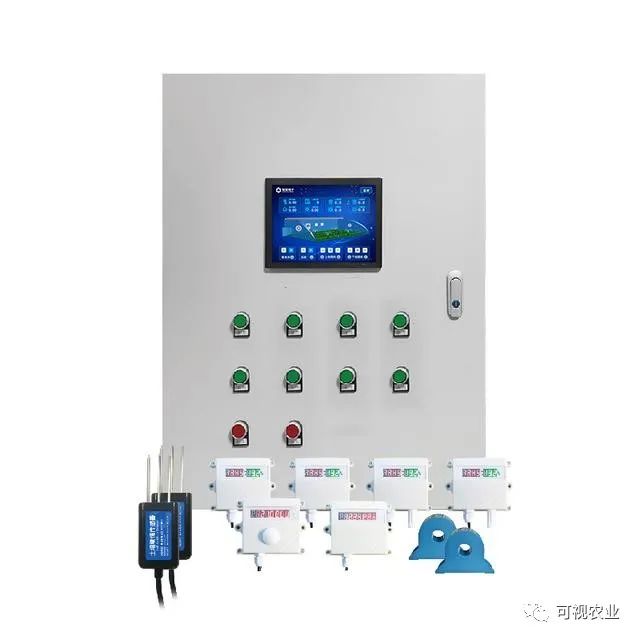 即大棚的管理、控制设备,常见的有:卷被保温、卷帘放风、湿帘风机降温、喷淋滴灌、内外遮阳、顶窗侧窗、加温、补光、照明控制装置等执行机构,接入智能控制柜中,联动调节大棚的温湿度、水肥灌溉、补光等,以达到远程或本地自动控制目标;